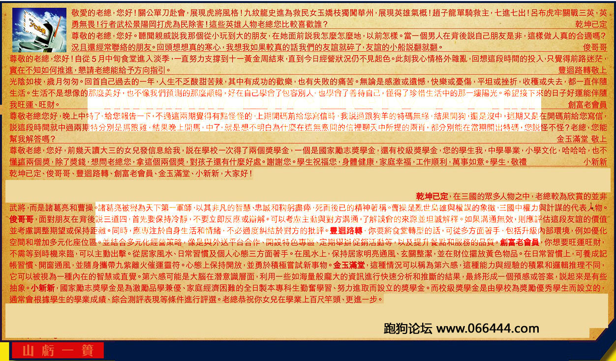 【5】.尊敬老總您好,晚上中特了,給您報告一下,不過這兩期覺得有點怪怪的,上期開碼前給您寫信時,我說過跟狗羊的特碼無緣,結果開狗還是沒中,這期又是在開碼前給您寫信,說這段時間就中過兩期特分別是馬跟雞,結果晚上開馬,中了,就是想不明白為什麼在這無意間的信裡聊天中所提的兩肖,都分别能在當期開出特碼您說怪不怪?老總,您能幫我解答嗎?